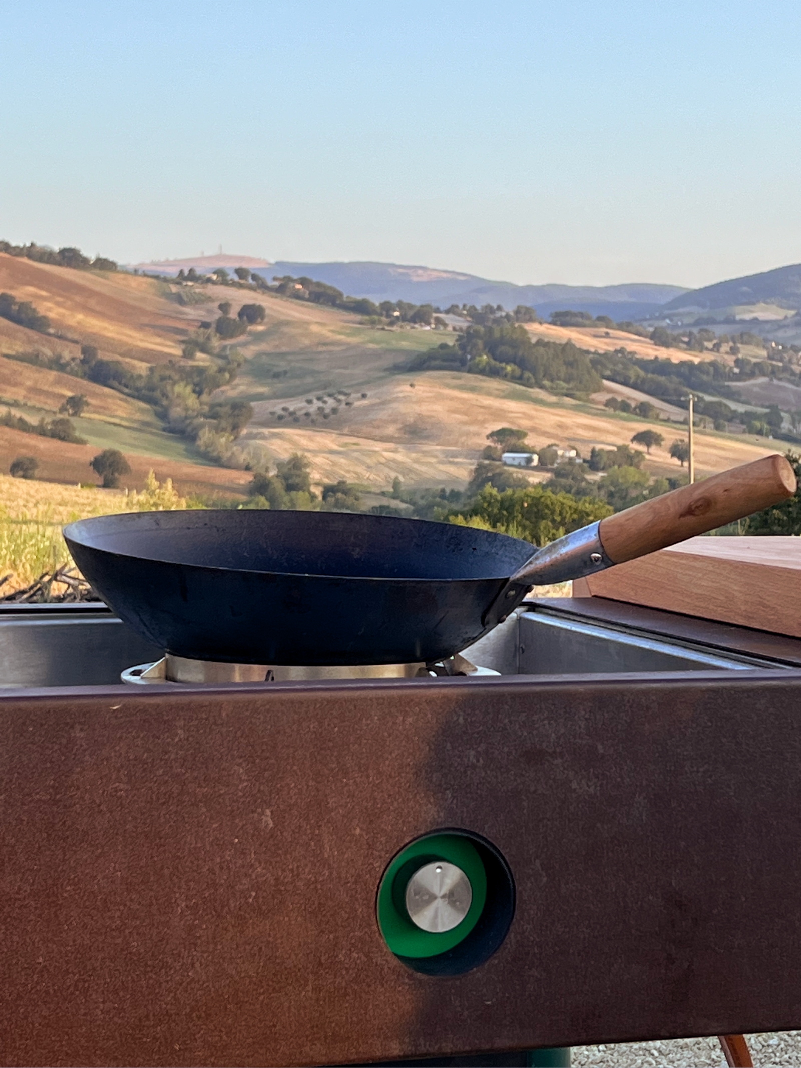 Versenkt eingebauter Wokbrenner und flächenbündige Grillplatte / Plancha mit großzügigen 55x55 cm in einer Arbeitsstation.