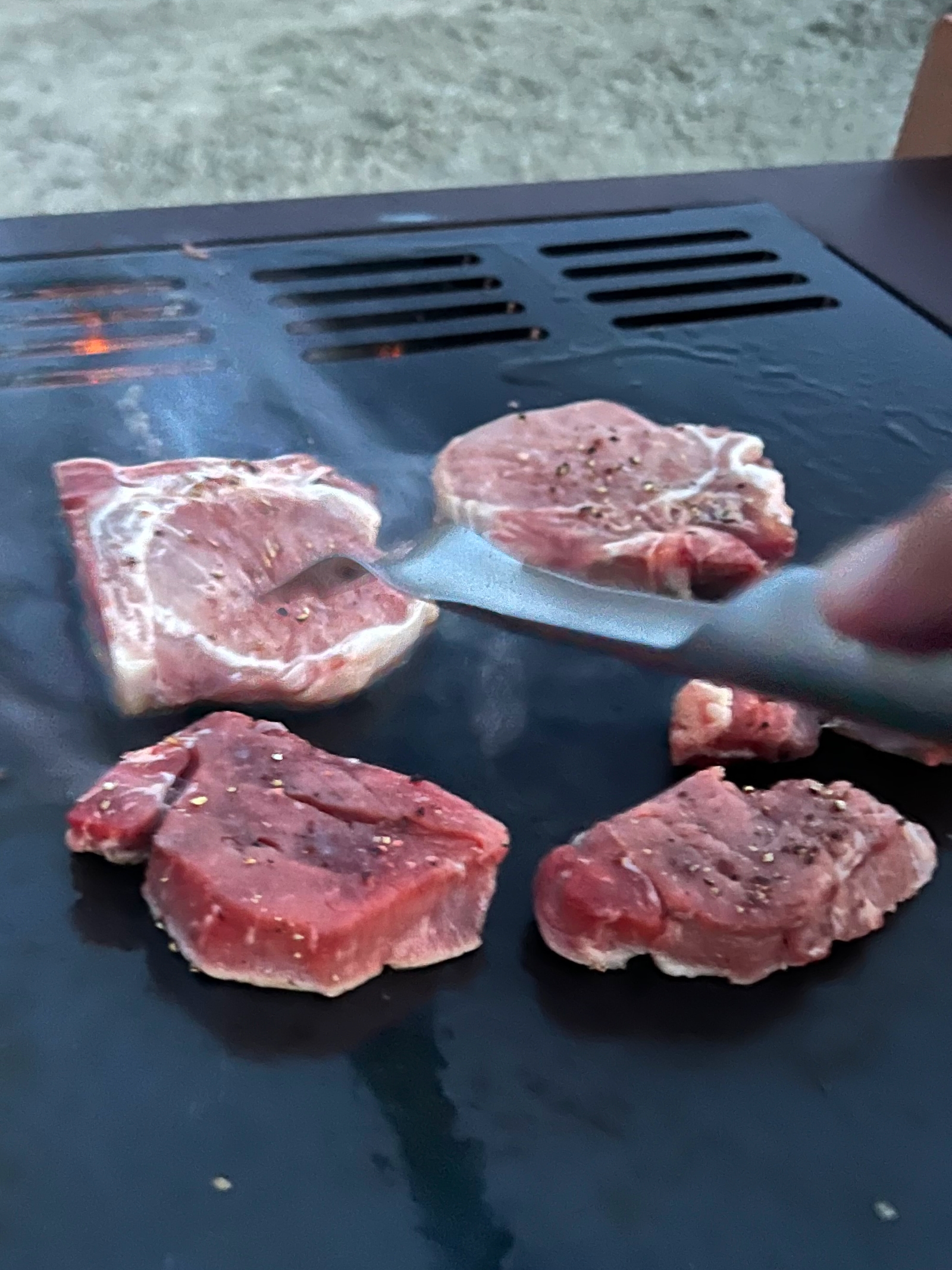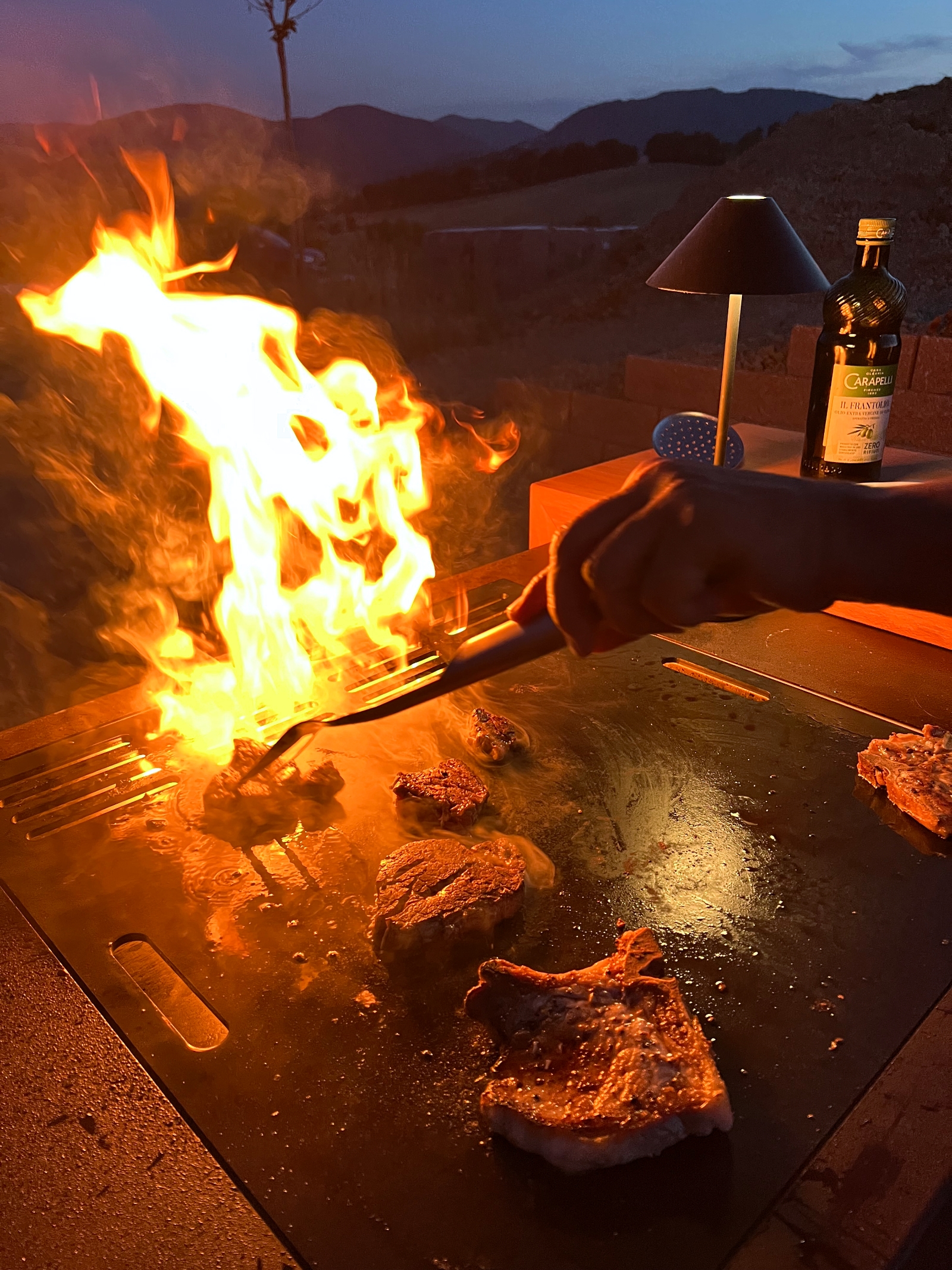 Die Feuerprobe mit Olive Ascolane, Schweinekotellet und Rinderfilet verlief grandios. Die 14 kW verschaffen der Grillplatte richtig Power und bieten Temperaturzonen von 350°C bis 80°C in den Eckbereichen. Hinten, bei den Lüftungsschlitzen geht's bei Bedarf richtig ab ;)